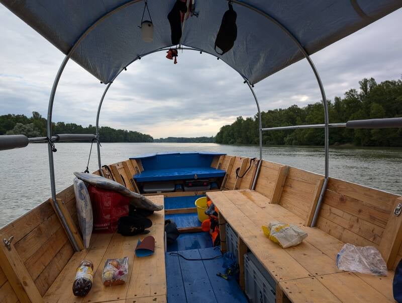 In Mannheim, there's a very strong wind blowing straight at us, and we ride waves on the Rhine. For a while, a police boat escorts us, but they are only watching.
