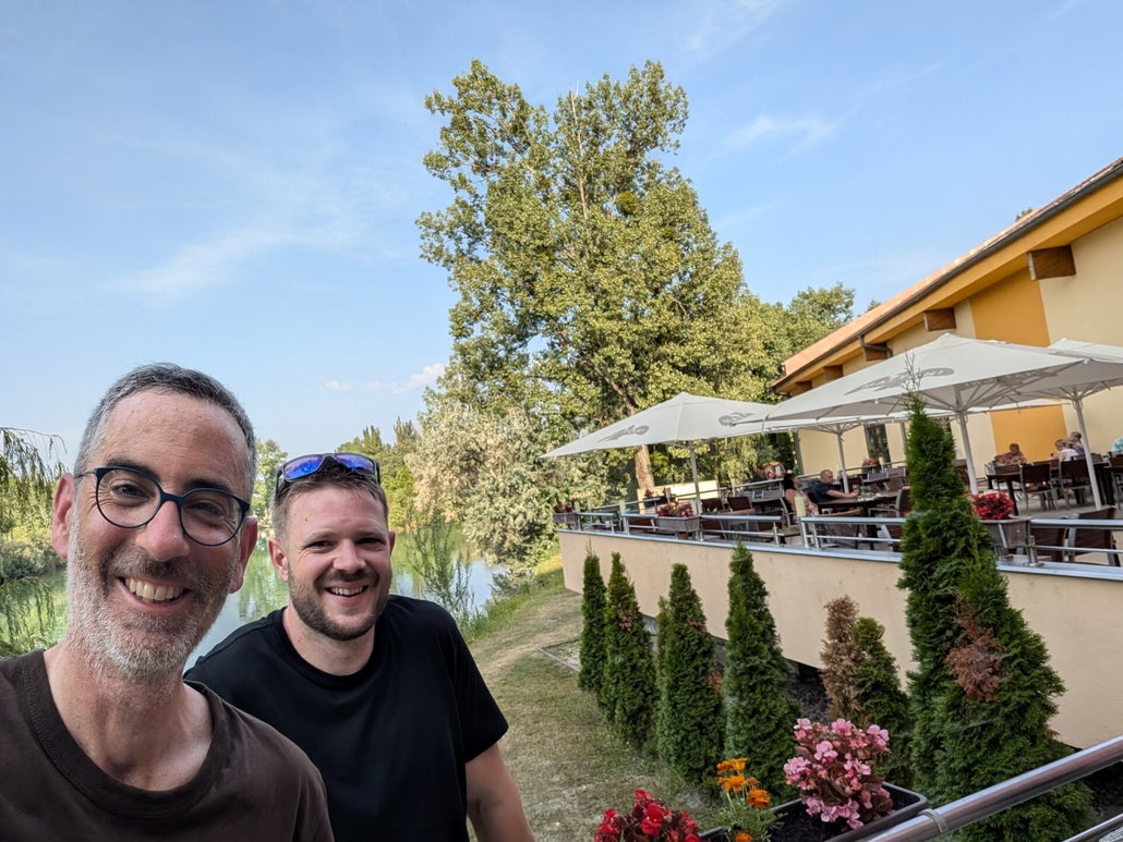 On the way back, we entertain ourselves with a bath in the Danube. The mosquitoes are entertained too! Back on the boat, they bite us every other second for the whole night. But otherwise, it's quite nice here.
