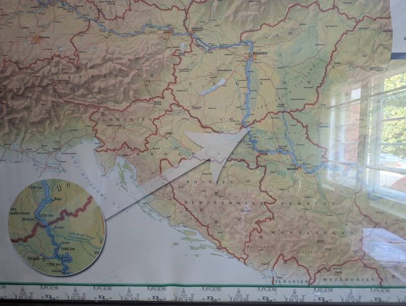 Nach etwa 10 Minuten Wartezeit kommt eine Frau aus einem gegenüberliegenden Raum. Sie ruft etwas zurück in den Raum, und ein Herr in Shorts und T-Shirt kommt heraus und fragt auf Englisch, was wir wollen. Dann bittet er uns in sein Büro und erklärt, dass wir erst in Ungarn hätten ausklarieren hätten müssen, bevor wir in Serbien einklarieren könnten. Wir fragen, was wir denn jetzt machen können um doch einzureisen.Er sagt "give me 100 Euro" und lacht laut. Wir lassen das Portemonnaie erst mal stecken und lachen mit. Er beginnt, unsere Pässe und Papiere zu kontrollieren und Formulare auszufüllen. Wir bewundern seine tolle Flusskarte während wir warten.