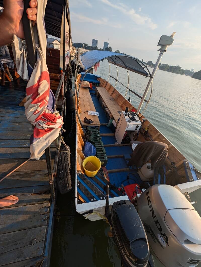That was another hard night. We were in the center of a Thunderstorm from 11pm to 3 am, and on top the mosquitos. Beni starts working on the boat at 5 am, which makes Emily rock constantly. I play dead until it smells like coffee at 6 am. The sunrise is a sort of compensation.